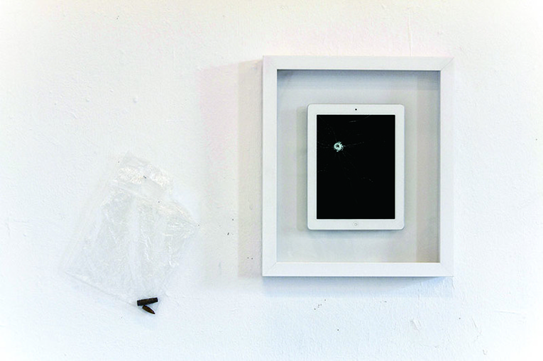 Responding to the recent return of military firearms in public spaces across Europe, ASSAULT brings the conflicting ideas of clean techno-consumerism and dirty battlefield warfare to a material collision. The artist fired an AK-47 assault rifle at an iPad and made high-frame-rate video and sound recordings of the bullet hitting the screen. The recorded video and sound are played forward and backwards in an endless loop on a functioning iPad.