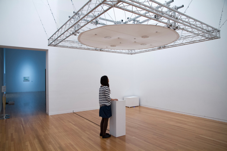 This artwork features a large membrane hanging in the exhibition space which is vibrated by the sound of the viewer’s blood flow detected in real time. Music can be played by controlling the vibration through variations of tension in the membrane. It is an attempt to produce something different to a string or tympanic instrument, a giant musical space that coexists with the environment.