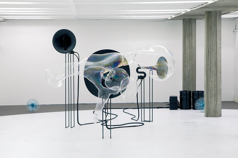 The nucleus of the work is the invention of an instrument that is operated by compressed air and that resembles a ship’s horn. With the sounding of each tone from three differently- sized horns, a huge soap bubble emerges from the horn. It grows, peels off the horn, lingers through the exhibition space and nally bursts at an erratic position within the room. Visitors witness the transformation of sound into ephemeral sculptures.