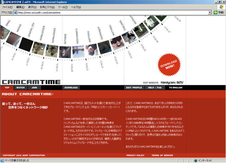 The concept of this work is “the clock that ticks away the images of everyone’s film shoots second by second,” or “a network clock that connects the world”. This concept, which has been realized in a comprehensible manner in the form of a screensaver clock, has a wonderful design, and is indeed very impressive. Furthermore, it was also impressive that everyone in the video image was smiling, even though they still had some of the Japanese shyness in their looks. This is evidence that the excellence of the concept has been conveyed clearly to the contributors of the images. This is a heart warming and precious piece of network installation work.