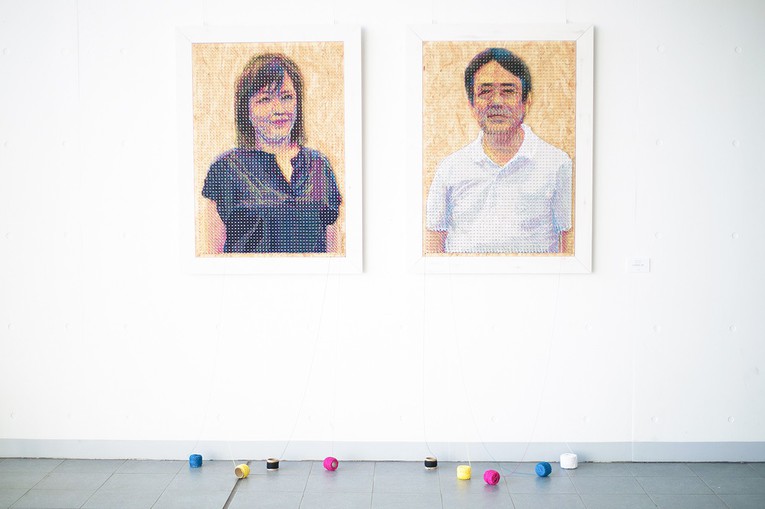 Five colors of string – cyan (C), magenta (M), yellow (Y), black (K), and white (W) – were attached by hand to over 3,000 nails arranged in a grid pattern to create a semi-three-dimensional portrait photograph. By arranging the strings in layers, the work produces the same effect as subtractive color mixing, creating a visualization of the printing process.