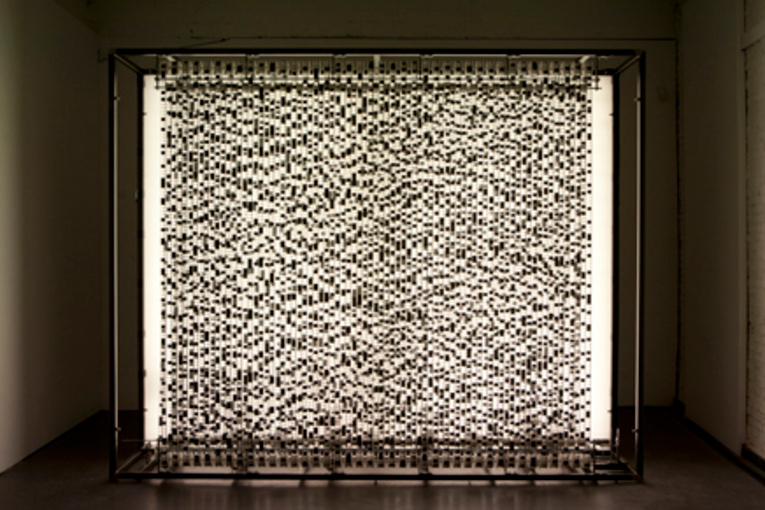 In a cinema projector, a film is transported through the mechanism and each single image is projected one at a time. In this installation, one loop of 35-millimeter film travels up and down over more than 150 guiding-wheels, to form a giant wall of film. The film consists of only black or transparent frames. In a cinema projector, the film is transported through a mechanism and each single image is projected one at a time. This installation combines three visual media–film, video and digital–to create an image through the literal “transport” of the film alone. An image akin to television static.