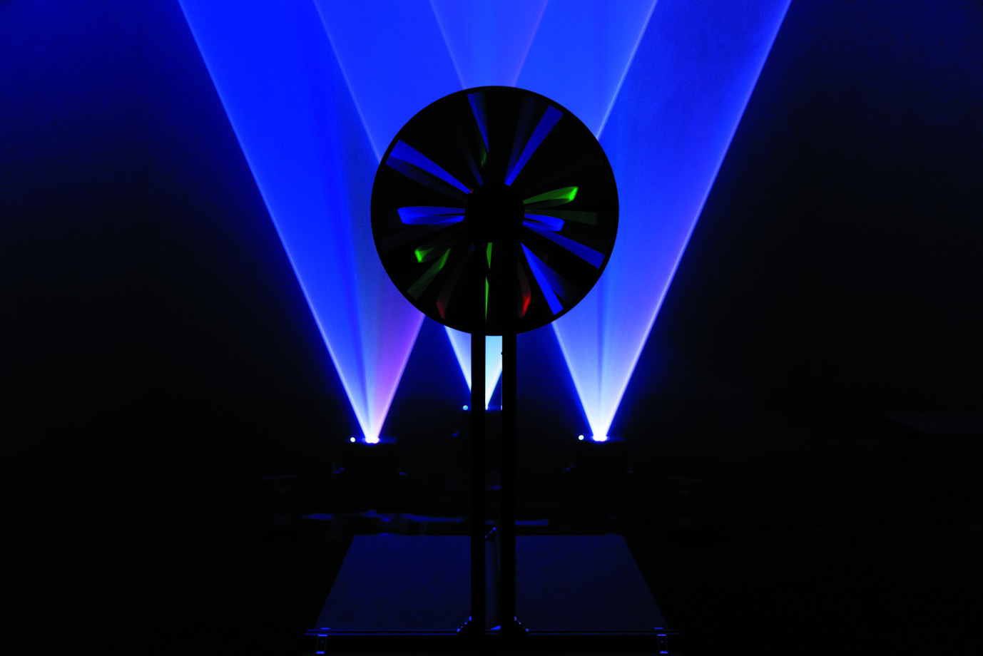 Work enabling a naked-eye experience of the rolling shutter phenomenon without the use of electronic devices like cameras. Installing a slit- ted disc in front of a laser projector and synchronizing the timing of its rotation with the laser illumination appears to make the light dis- tort and interrupt. The installation evokes a reality that does in fact exist but comes to dis- appear in its meeting with human perception.