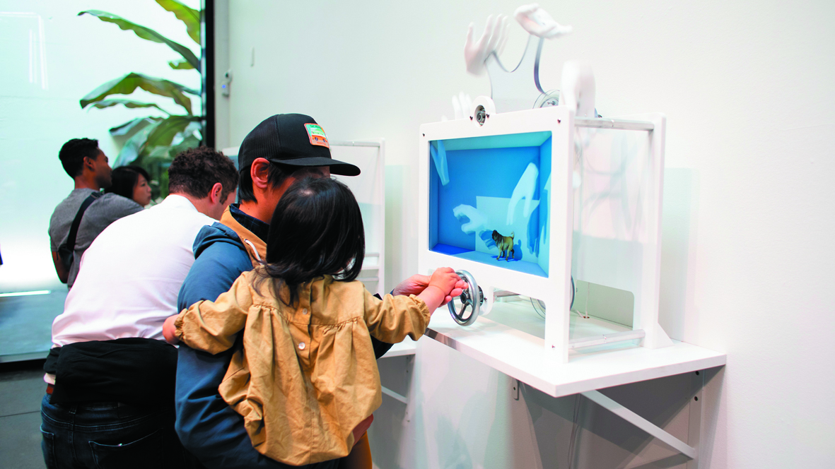 A triptych of digital kinetic artworks that mediate viewer interactions with virtual wildlife. Each machine combines a physical hand mechanism controlled by the viewer that interacts with a virtual natural environment. Our current economic system treats nature as an infinite resource, with technology serving to amplify these disturbances to the planet’s equilibrium. The work invites viewers to contemplate this relationship through a surreal lens.