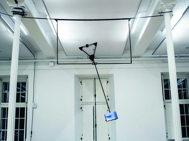dist.solo deals with intimacy felt at the moment of eye contact, and also the complex nature of relationships. A swinging monitor reveals a girl’s face partially, almost like a wiper on a car window. Her eyes can only be seen momentarily due to the kinetic movement, but emotional connection is felt when the eyes meet. In the title, “dist.” is an abbreviation of distance which refers to both physical and emotional distance in this work.
