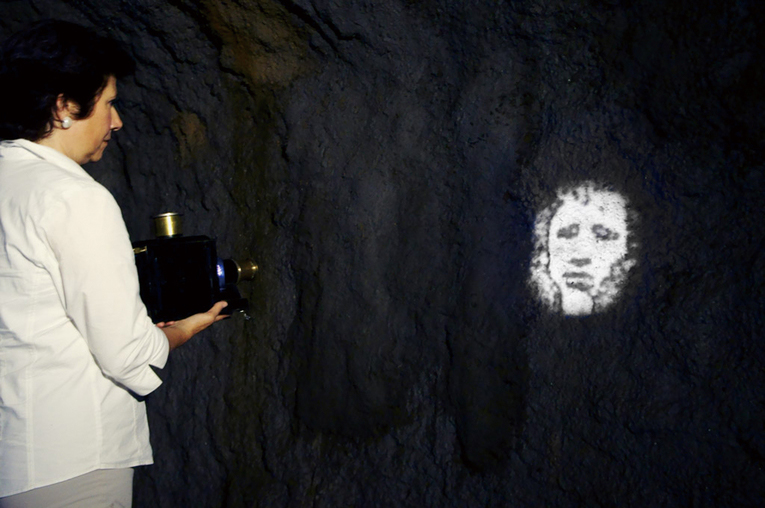 Excavate consists of a magic lantern from the 1920s that has been transformed into an interface. When visitors shine light onto the installation walls, various dark particles appear, looking a bit like isopods. At one point they assemble and faint faces of children develop.