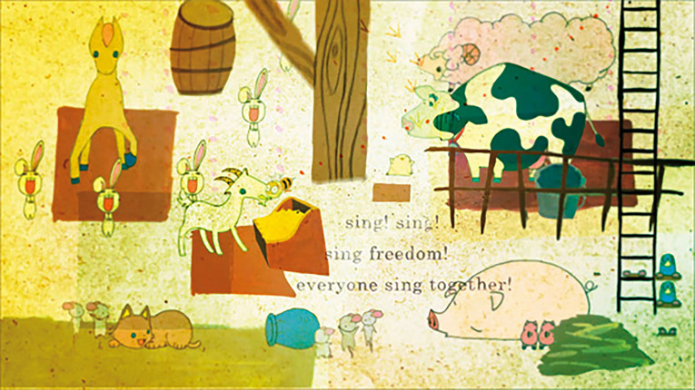 farm music is a musical animation that features a delightful melody composed of the chirps, cries, footfall, biting and chewing sounds, and tinking of bells of various animals, such as baby chicks, goats, pigs, cows, moles, cats, mice, etc. By using simple clean lines to depict the animals against the backdrop of the rhythmical flow of the music, the artist strives to convey the lively atmosphere and warmth of the farm, and pursues the fun experience typical for animation movies.