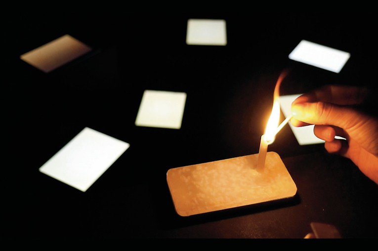 When a burning candle is shown on a smart phone, it causes video feedback, giving rise to colors that change with the shimmering flames. By taking advantage of the fluctuation that occurs each time the light of the flame is transmitted to other devices, the artist makes the duration of the shining lights vary. In the darkness, our senses grow increasingly acute as we give ourselves over to the flickering images.