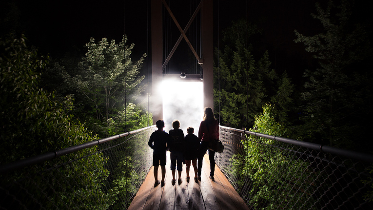 Wanting to showcase its charms, Parc de la Gorge de Coaticook commis- sioned the production team to create FORESTA LUMINA, an illuminated night walk through the forest. Visi- tors are invited to discover an en- chanted trail winding 2.6 km through the woods. As they walk through the mysterious forest, visitors meet char- acters inspired by the area’s myths and legends, who draw them into an immersive adventure.The scenography, combining projec- tions and lighting, is accompanied by an ethereal soundtrack. The result is an unparalleled sensory experience. The production team custom-made the entire experience, including perforated metal panels resembling ancient manuscripts, lighting units designed to look like fairies, video mapping on natural elements and more. The multimedia installations are seamlessly integrated into the surroundings, creating an all-encom- passing sense of magic.