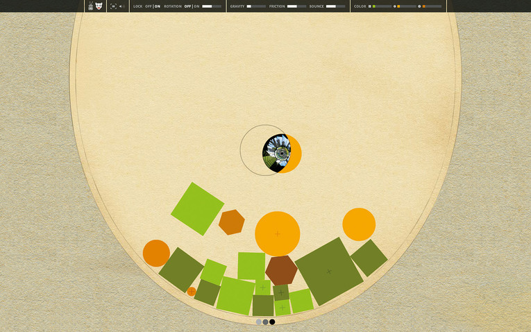 Fredo Viola’s The Turn is an interactive, toy-like site that showcases Fredo VIORA’s music and unique video work. Traditional rectangular videos are joined by circular and hexagonal works. When shapes collide they generate sounds in conjunction with the interactive background music and adjustable physics parameters. He is a multi-media artist based in New York City.
