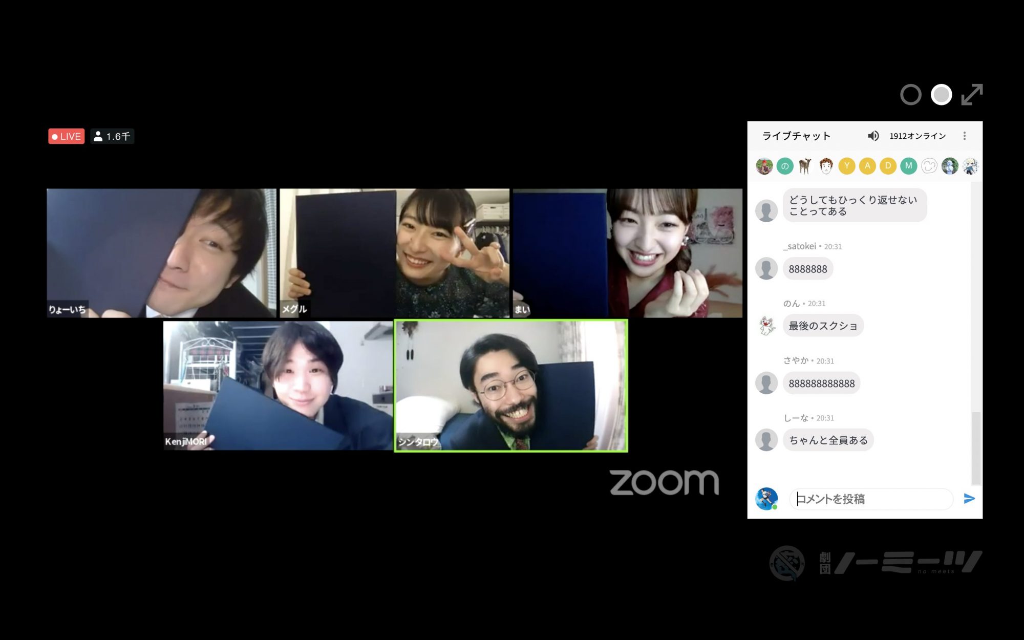 GEKIDAN NOMEETS is an online theater company that produces plays remotely without any physical meetings from rehearsal to performance. Under the theme of “intense time with no three Cs,” it was founded two days after the state of emergency declaration in April 2020 in response to the coronavirus pandemic. The members are mainly creators in their 20s from the film, theater, events, advertising, and engineering fields. Its early works (140-sec plays produced using Zoom) were posted on Twitter and viewed more than 30 million times. Since May, full-length performances have been live streamed for a fee, attracting more than 10,000 viewers in total. GEKIDAN NOMEETS opened up a new area of activity for the pandemic-stricken entertainment industry, through a new form of theatrical expression, created without physically meeting each other. Possibilities for online artistic expression have been sought since the second performance, including remote camera work and lighting control, as well as a play in which the story changes according to the audience’s choices.