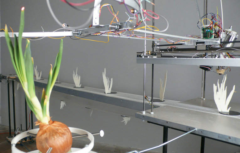 Since the 18th century, artistic presentations have first been differentiated according to whether they are examples of temporal or spatial art, and have been separated into genres on the basis of the character of each medium. In the 20th century, objective measures of time and space have been acknowledged as simply personal facts structured by media. This is the starting point of thought and art in the 20th century. By inheriting this idea, the significant potency of what is currently called media art is precisely related to the restructuring and defining of time and space. This work is a machine that replicates the daily growth of the above-ground part of an onion as a model. Generation originally means displacement of temporal persistence to spatial divorce, i.e., pluralization. Time is neither more nor less than a solution drawn by spatial divorce. The embodiment of time is the theoretical core that pierces through the history of presentational media including sculpture and film. What this work represents is a deep insight into media as a system for generating space-time.