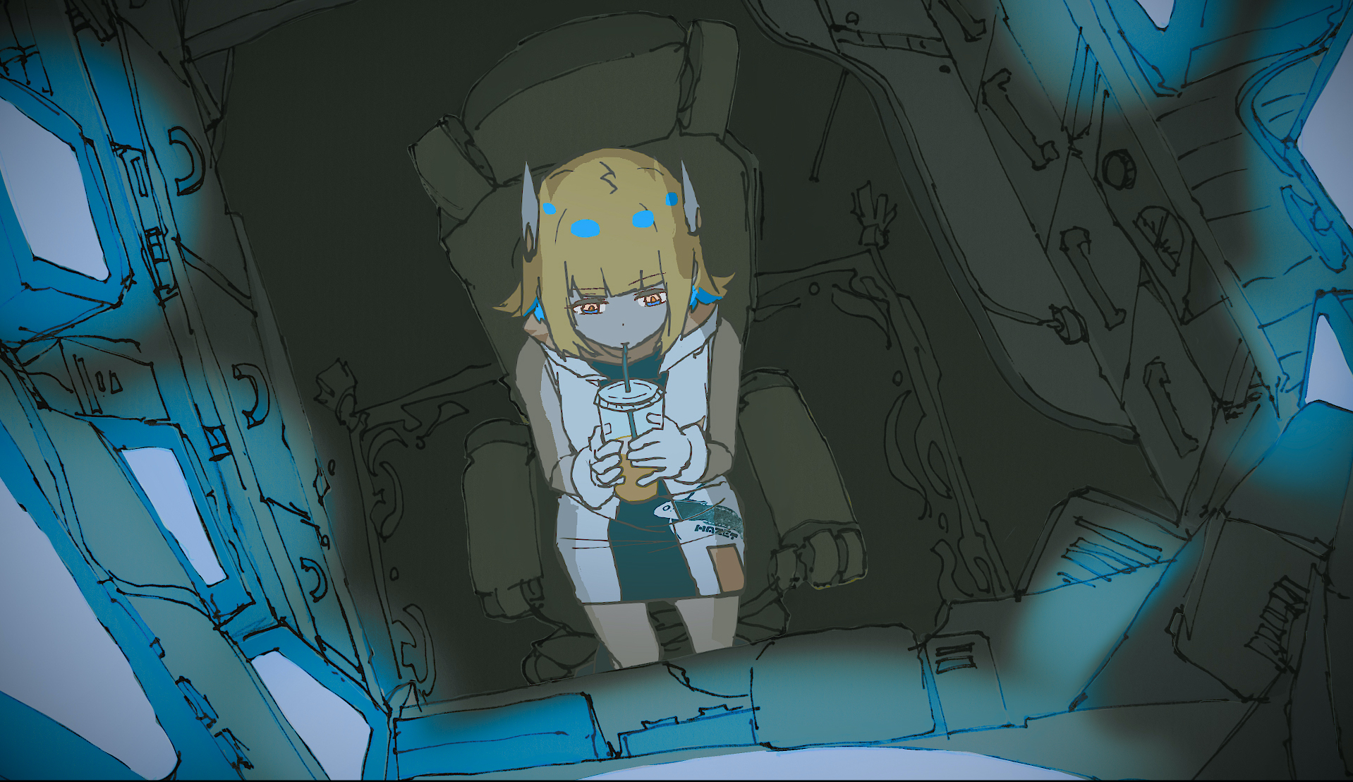 The music video for “Haze Haseru Haterumade” by the “music unit”—or musical collaboration—ZUTOMAYO. Matched with an energetic, high-pitched voice and thrilling musical sound, the video is a retrospective of a girl who bids her friends and past farewell and takes to the stars alone. She changes from her everyday attire to something like a space suit. From there, the animation matches the lyrics and melody and has her singing into a microphone, zooming through outer space on a surf board, drinking juice and watching monitors on a starship, and dancing to the rhythm of the music. Amid all this pop imagery, the video cuts to bizarre creatures and ruins, and the occasional use of a font with an ancient touch suggests a decadent world. Viewers are also compelled to wonder about the mysterious figure under a black-and-white striped hood and who it might be to our heroine. Rather than following a single story, the video prioritizes the music and aims to enhance its charm with evocative imagery.