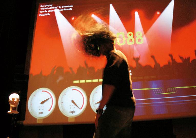 Headbang Hero is a videogame for testing your head-banging prowess that induces heroic disregard for your own health. Wearing a special motion-sensing wig, you are awarded points for vigor and timing while you head bang to the powerful chords of heavy metal music. When the game is over, a personal report is printed out for you, including data about your performance, the amount of real damage you sustained during play.