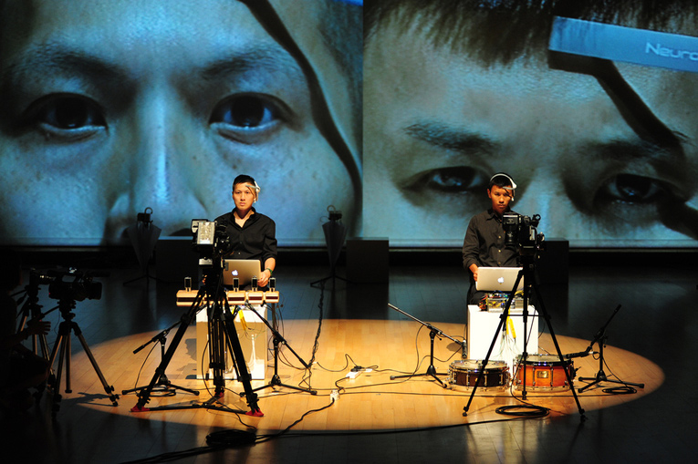 The performers sit motionless as brainwave sensors monitor their focus level. Once the focus level exceeds a certain threshold, a device is actuated to play a set of percussion instruments on stage. The focus level is notated on a musical score, which the performers will attempt to execute. While the ability to focus depends on a number of external factors, distraction can be reliably “performed” by rapidly rolling the eyes or otherwise inducing neural stimuli. This constant struggle between focus and failure-to-focus, absence and presence is amplified through sound and put on display.