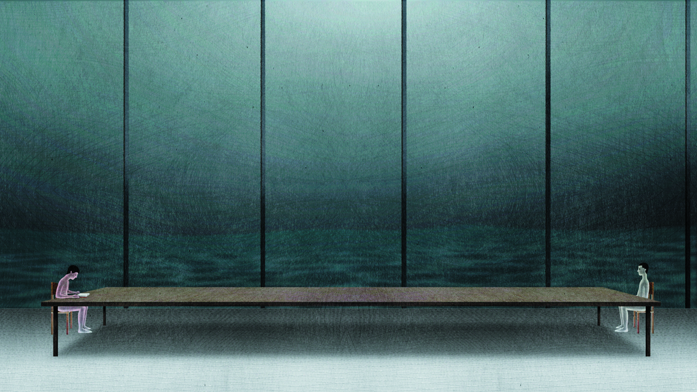 A person is sitting at the end of a long table, reading a book. Another person appears, sits on the other end, and begins to throw red balls to the other. The balls are not noticed at first, but when it hits the head of the first person, the twoway relationship begins, but only to end without warning. The work portrays the pain of disappointment we all get when a relationship ends and the fragility of interpersonal relationships.