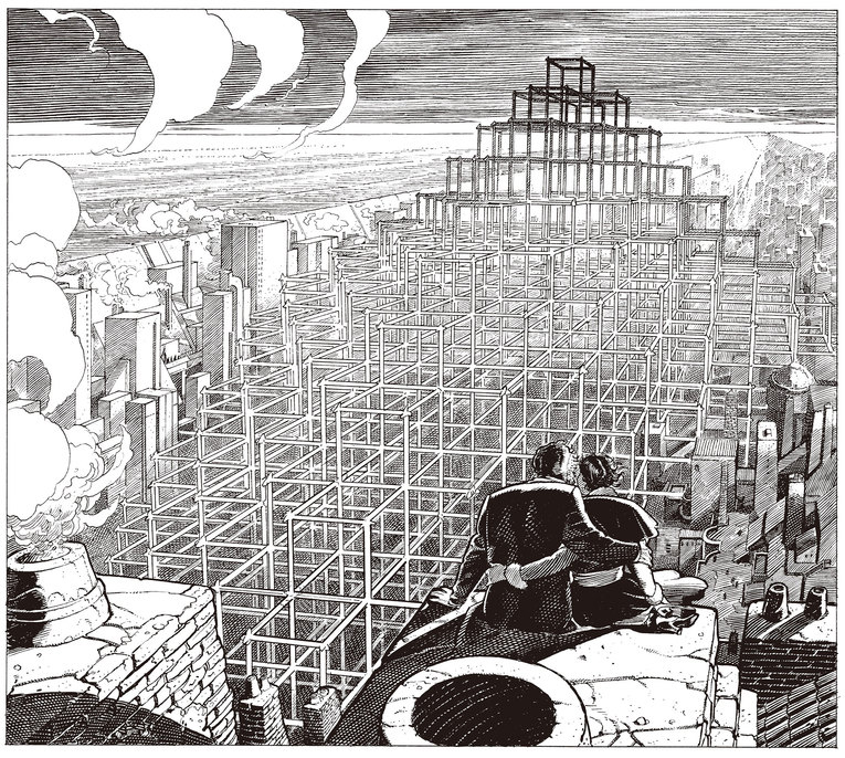 Les Cités Obscures is a series by two men who graduated from the same middle school in Brussels; SCHUITEN is in charge of the artwork and PEETERS handles the script. Though human protagonists appear in the stories, the lead role belongs to the alternate world they populate – its environment, architecture, background. Issued in the bande dessinée format of French-language comics, the series earns praise for the intricacy of its artwork wherever it appears. Now it is finally being translated and published in Japan, where readers may at last savor the sublimity of PEETERS’s story in tandem with SCHUITEN’s illustrations. The first volume in the series was published nearly 30 years ago, but the story is timeless. Before we start making claims about Japanese manga’s pride of place in the world of comics, we had best acquaint ourselves with the level of comics in the rest of the world. This is one work well worth knowing about. It is one of those rare creations that yields both the pleasure of encountering a foreign culture and the joy of sharing something that transcends cultural differences.