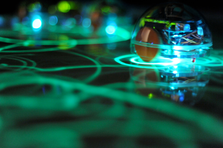 The lumiBots are small and round autonomous robots equipped with a UV LED. They leave a trail of visible phosphorescence as they move across a luminesence mat. With their light sensors, these robots can follow the other robots’ traces and reinforce them, similar to the pheromone trails created by ants. The luminescent tracks left behind by the lumiBots gradually fade away, thus forming a dynamic display of emergent structures which are the results of the interaction between the robots and influences from the surrounding, and are not pre-programmed or predictable.
