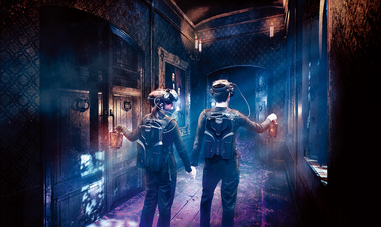 Individuals can walk along a VR space in this immersion experience. The participant de- pends on the light of a lantern he or she holds and encounters the backstory and various frights while actually walking inside a virtual western-style building. Utilization of VR gog- gles and a camera allows the participant’s own body to be seen in the VR space to accomplish a heightened immersive experience that feels as if a different world has truly been entered.