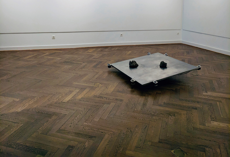 Two stones lie on top of a balanced steel plate. The aim of the machine is to create a perfect equilibrium state by moving the stones to the appropriate positions. In an perpetual process the system succeeds to prevent the imminent divergence again and again by its permanent endeavors. Instead of the pursued state of well-adjusted stability, the work arrives in a fragile but constant situation between fall and oat.