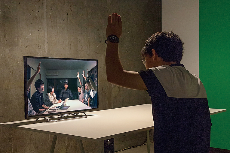 This work incorporates the viewer seated be- fore the display as a performer in the video in a place chosen by majority decision. The visitor is questioned by the people appearing in the video and raises his/her hand to state his/her opinion, and in this way the story is played out.