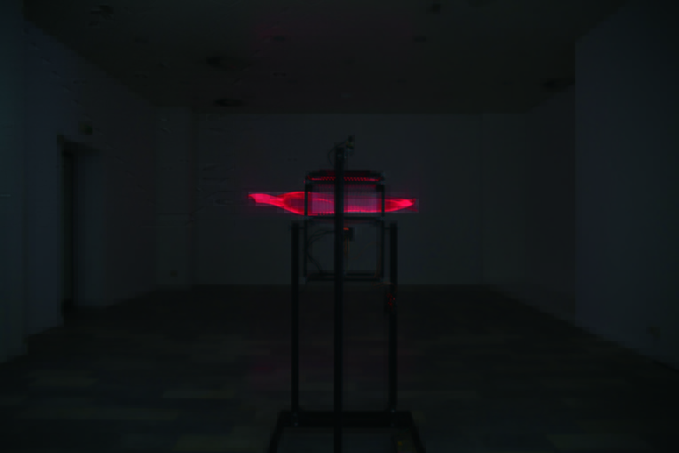 Mirage projects a landscape based on its perception of the magnetic field of the earth through a magnetometer. Mechanical actors deform the surface of a thin mirror, according to the state of the system. A laser line touches the mirror surface and makes the deformations visible on a wall. Through the constant shifting signals, the projection resembles the experience of wandering through a landscape.