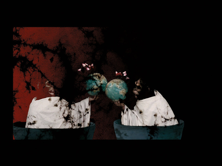 MMIX (Roman numerals for 2009) is a timeless work in four interactive tableaux, where each visitor is invited to follow with his eyes and ears to what his mouse gestures reveal. At each touch, sound and visual elements are randomly muddled up on the screen, creating new combinations always. This work humor and drama are cruelly mixed to suggest the sad patterns of our contemporary reality.