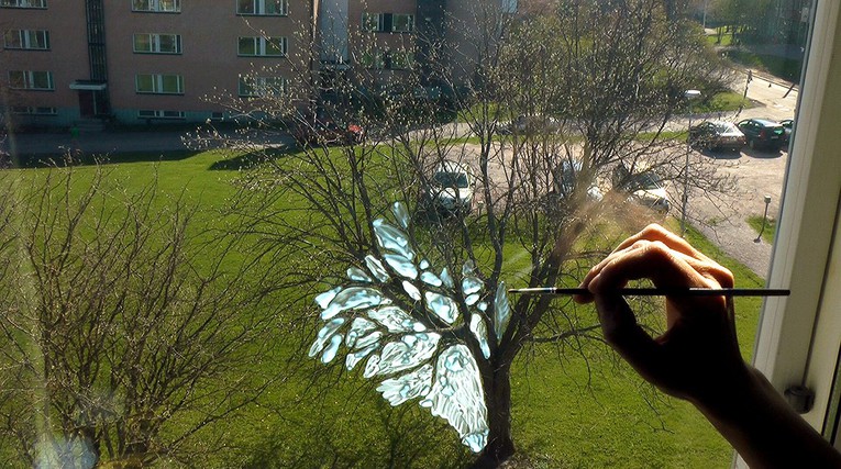 A hand paints an outline for a tree on a window on a sunny spring day. People and cars pass by in the suburban backyard. The painting advances little by little. Passing of seasons is filmed through the aperture created by the painting. The work describes a gesture of mark making and note taking in an everyday environment.