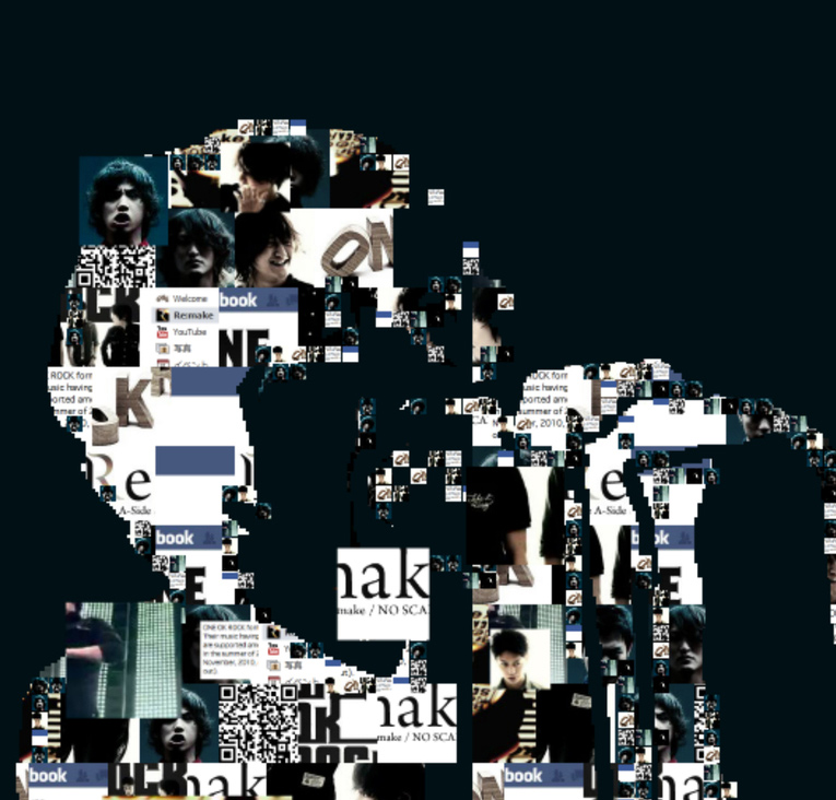 A promotion site for the rock band ONE OK ROCK’s single Re:make. Visit the band’s Facebook page, and its user interface begins to crumble away in time with the vibrations of the music. Once the “friend” icon and other user information have been read, the original music video begins to play. High-quality sound and visuals heighten the effect of the performance.