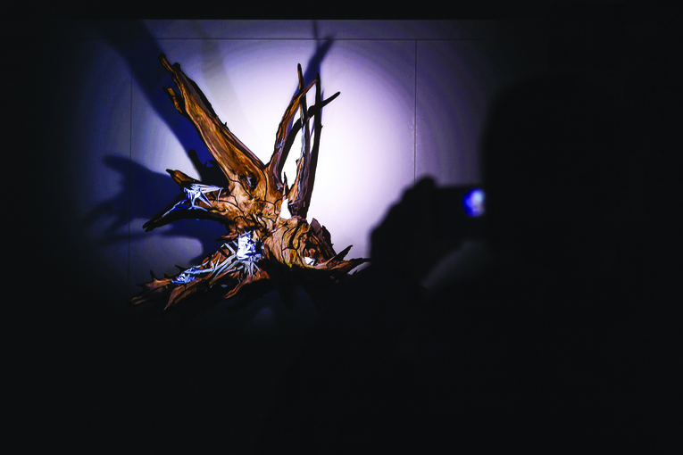 This is a work that projects moving images on a tree root. Though projection mapping is already a widespread technology, this project reexamines it with sincere interest and succeeds in improving it. With the technique to accurately map complex organic surfaces, an uncanny image that straddles the border of the real and the virtual was created. This piece, with the unlikely joining of digital techniques and real objects, allows the beauty in nature’s design to emerge, while at the same time, by making full use of the technology, alters and expands the concept of digital aesthetics. It is fascinating that the relationship between “object” and “information” in the present age surfaces when the boundaries between nature and technology are blurred as in this work. (KUDO Takeshi)