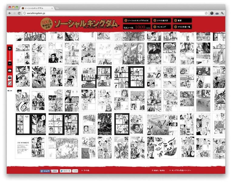 In what is the world’s first “social manga” project, 1,153 people helped draw the manga KINGDOM, one person to a f rame. Launched with an invitation to all fans of the work to par t icipate, regardless of their drawing skills, this collective creative event included professional manga artists, painters, and a host of amateurs. In only a month they completed the manga with the world’s largest number of co-artists.