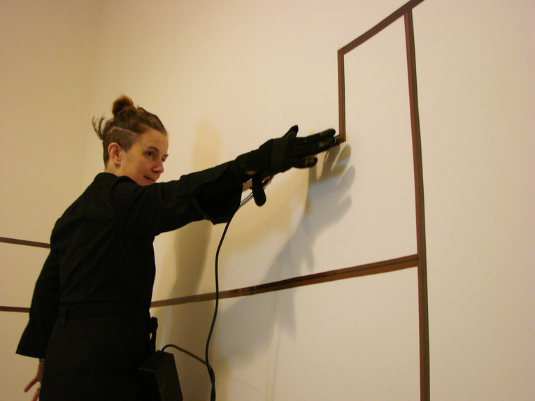 Sonophore is a site-specific interactive sound installation. Unspooled audio cassette tape is attached to the walls of the site, and a special device attached to a glove is used by visitors to reproduce the sound recorded on the tape, thereby easily creating effects such as fast forward, rewind, and play. The physical arrangement of the unspooled tape along the walls also has an aesthetic effect that adds a sense of mystery to the exhibition space.