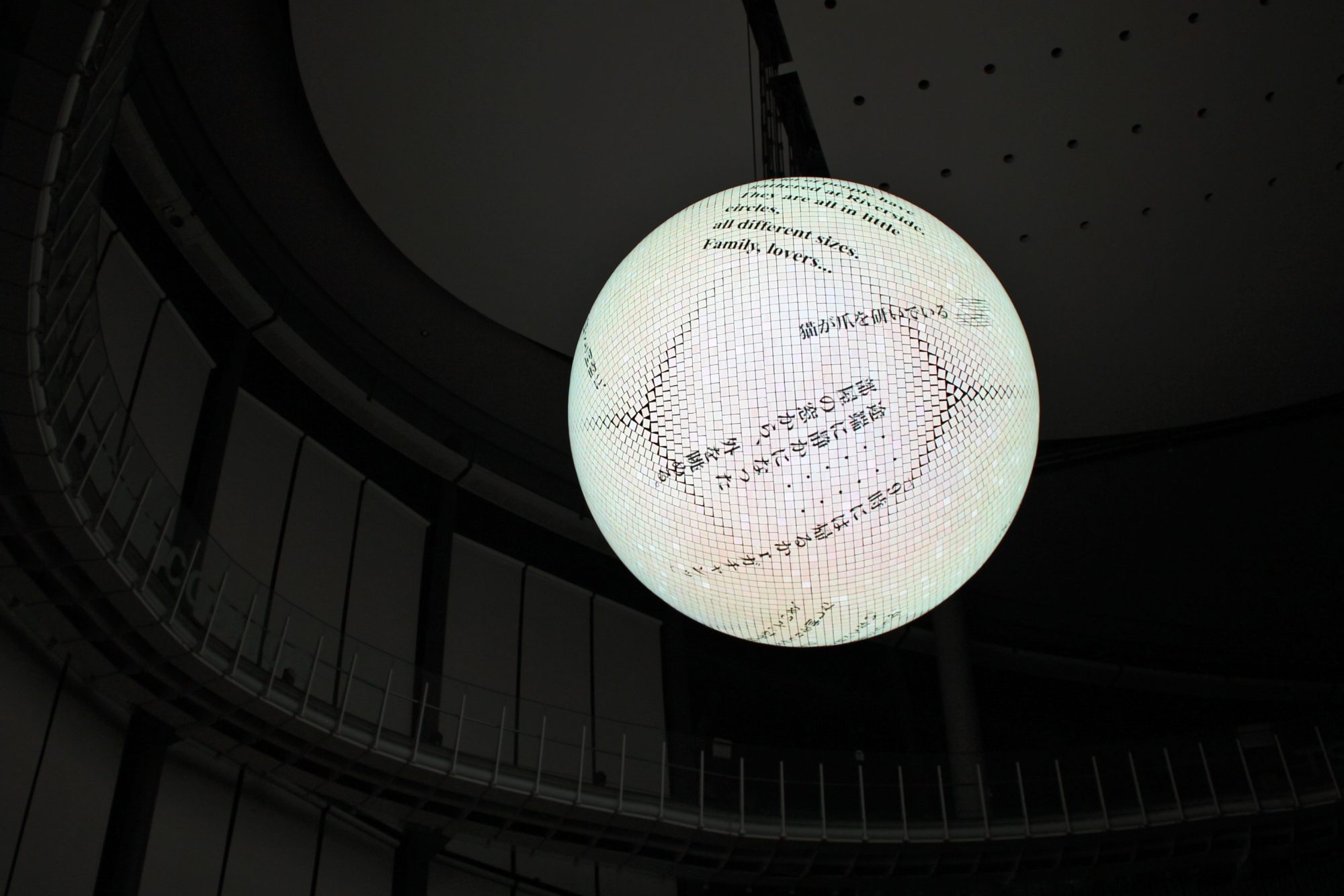 A work that projects text passages from a novel onto the Geo-Cosmos to fully capture narrative scenes in the same way that 360° imagery, such as VR, achieves full capture of surrounding views. Book pages here take on the form of “layers,” like those of an onion, with the peeling off of one layer revealing the story’s continuation. Those who are reading are offered views from a choice of different locations. These include the 1st floor directly beneath the globe, the 3rd and 5th floors facing the atrium with lateral views, and the Oval Bridge encircling the sides of the Geo-Cosmos. Each page contains a number of different events, all occurring simultaneously. Readers can each continue through the story from the position of their choice. Unable to get a complete view of the text displayed on the massive sphere, though, they are denied access to the novel’s full contents. Gazing at the sphere from their respective standpoints, multiple readers can together share in the experience of the same story at the same time, even while imagining differing scenes.