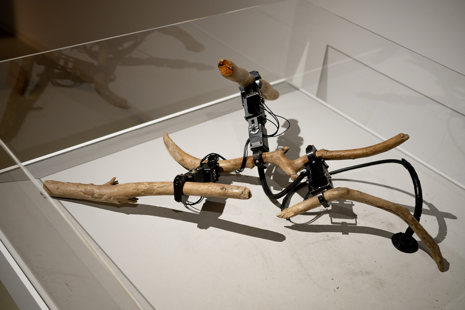 A work focusing on the learning process to “stand up,” a basic move of living organisms. A machine consisting of tree branches and an electronically-controlled motor generates movements through machine learning algorithms, with an aim to maximize the height from the ground. The shapes and random movements of the machine parts result in unpredictable movements and incidental positions, questioning viewers about animate-inanimate boundaries.