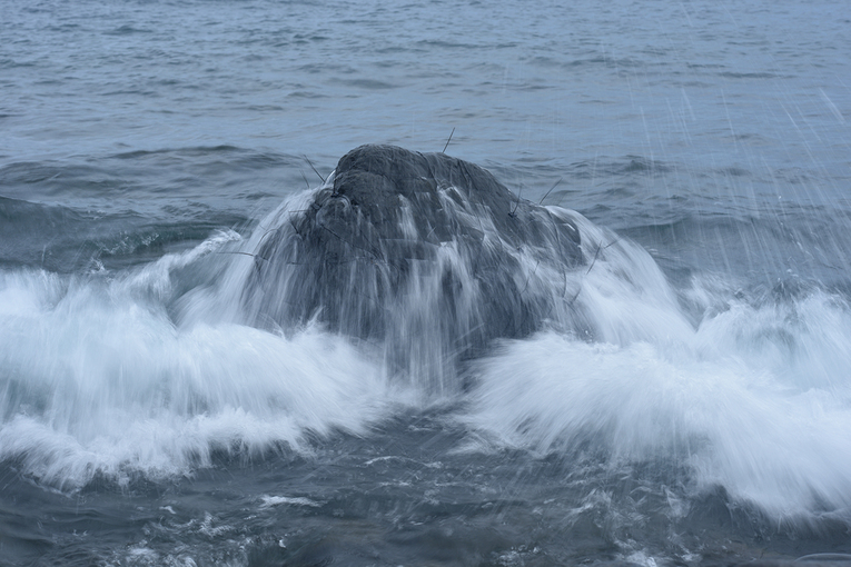 A stone on a shore of the volcanic island, Ul- leungdo. Water sensors are installed on the stone surface, and wave data is collected. At the exhi- bition venue, the video of the wave breaking on the stone is played on the screen. The wooden structure placed next to it has 64 solenoids which tap on the speci c parts of the structure to recre- ate the sound and vibration of the wave. One can get into the structure and become a stone.
