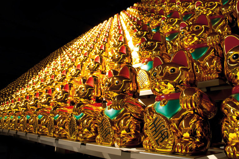 The “Lucky Cats’ Matrix” contains 520 shiny golden XXL Lucky Cats, made of plastic, which are arranged on a ramp-like stand made of aluminum. They can perform spontaneously with salutatory and signalizing gestures as well as mass movements. Visitors can input sentences which are displayed with the paws letter by letter as a sliding text marquee like “inscriptions.