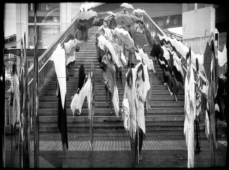 These Timescan Photographs of cityscapes in New York, Berlin, Tokyo and Prague were taken by exposing successive segments of a single frame from left to right using a custom-made digital scanner camera. The use of a technique similar in principle to a focal-plane shutter results in moving objects appearing visually warped, while static objects appear as they would in a conventional photograph. The image shows the continuous flow of the moving object, thereby creating a diagram of time in a picture that frees photography from the limitations of “moment-based” imagery and transforms it into a “time-based” medium.