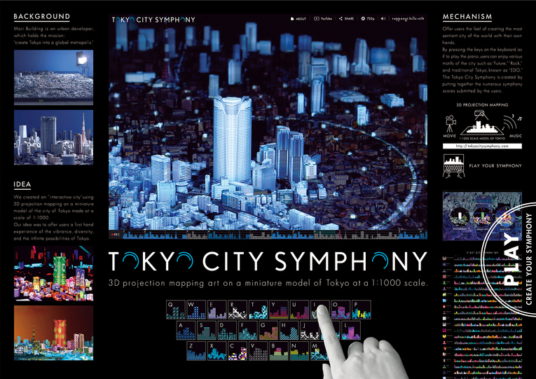 This website lets users control 3D projection mapping on a 1/1,000-scale model of Tokyo’s cityscape. Various visual motifs for the city (futuristic, rock, vibrant nature) are assigned to keys on the users’ computer keyboards, as well as beautiful sounds, allowing participants to have fun playing music by typing.