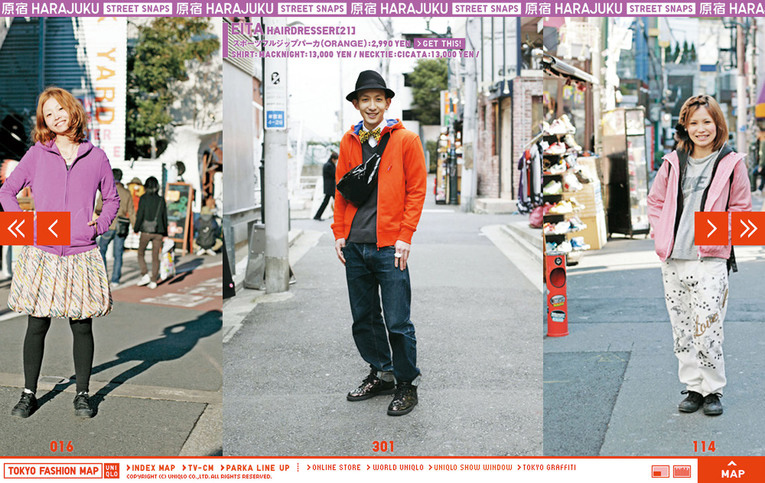This website shows the parka style of 1,000 people on the streets of Tokyo. There is an overwhelming volume of content, including a Parka Relay Movie that illustrates towns with parkas; Street Snaps of 1,000 people; and Maps, which utilizes GPS and Google Maps. The viewer can see the 15 major areas of Tokyo and the fashion characteristics of the people.