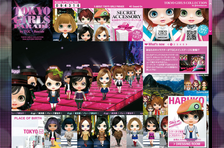 This is a promotion site for Tokyo Girls Collection (TGC), the biggest fashion festival in Japan. The users can customize the fashion and makeup of their avatars, then go around the websites. The avatars were featured on the screen of the TGC fashion show and formed a fashion parade; their parades have been seen everywhere, from mobile phone wallpapers and blog parts to the mixi application.