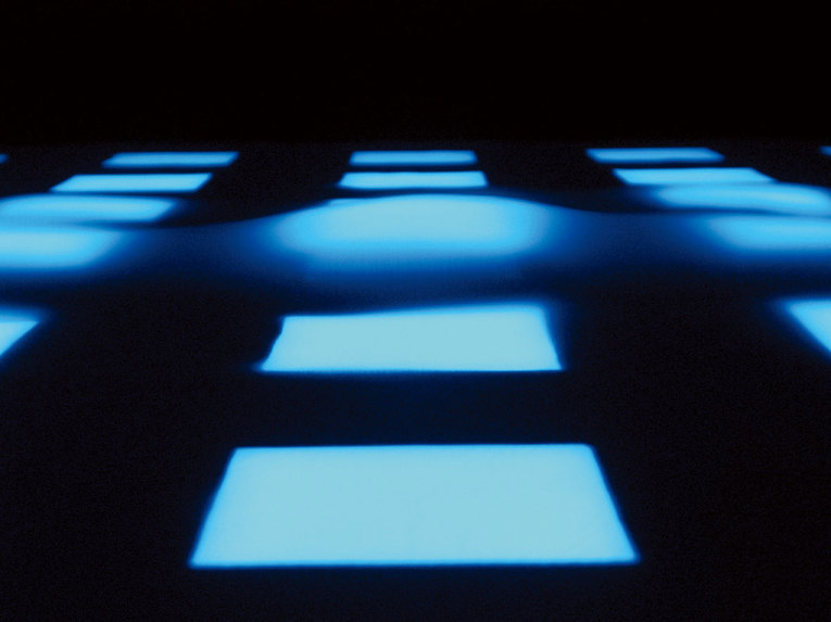 A white box is placed in the center of a dark space, on which blue light changes its patterns when people around it move, producing an unrealistic atmosphere. Square dents are placed in a matrix inside the top panel covered with a thin white cloth, and when propellers in each dent start spinning, the white cloth is lifted slightly by the wind, spreading soft blue light emitted from inside each dent. The idea has intriguing unpredictability, and it was surprising to find that a propeller like a taketonbo (a T-shaped flying toy made of bamboo) could produce such changes. Here, analogue materials of wind and a cloth are fully brought to life.