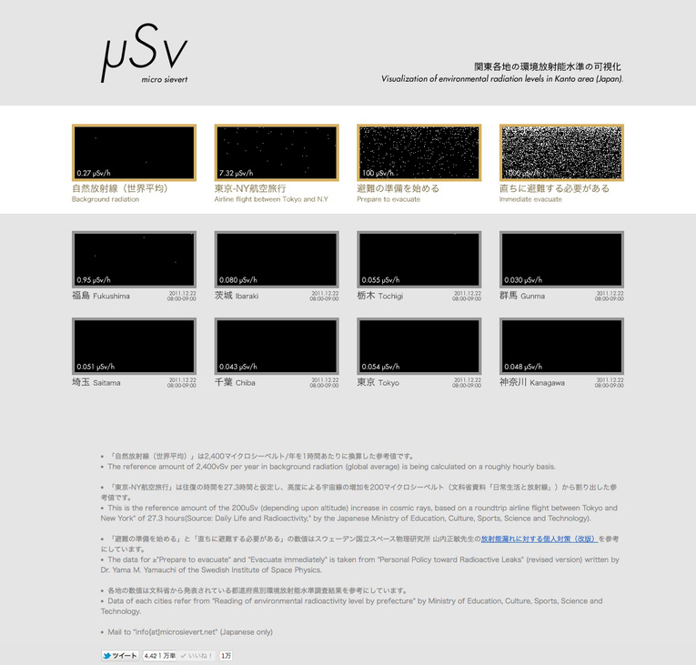 ©2011 copyrights.microsievert.net All Rights Reserved. 15th Art Division Jury SelectionsVisualization of environmental radiation levels in Kanto area (Japan).WebYOSHIHARA Jun / OGAWA Yukihiro / Junko & Richard HOLBROOK / CHONO Kaoru BACK TO AWARD LIST