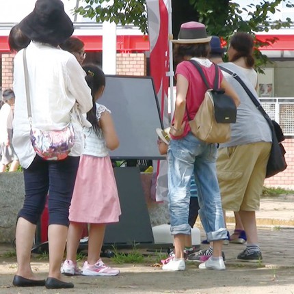 A device that forces one to experience the typical TV program joke, in which the camera installed above a monitor zooms into a recognized face with a “kaaaaaa!” sound effect. By encouraging users to investigate ways to play with a camera that zooms in on their face in a room or a park, this work brings laughter and shared pleasure to those who experience the zoom.